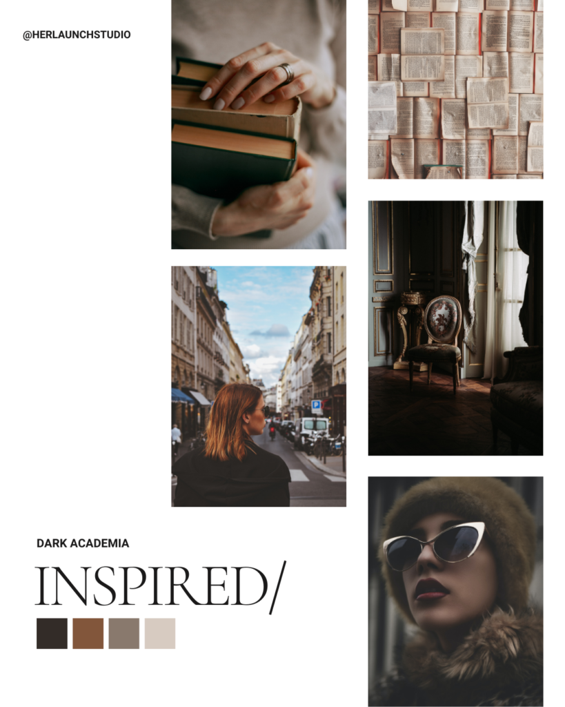 The Dark Academia Aesthetic is a smart and thoughtful look inspired by the preppy school looks of old-world academia. It has a refined yet mysterious feel that is perfect for entrepreneurs who want to evoke an air of sophistication to their brand. Muted colors, tweed fabrics, and classic silhouettes are key elements of this aesthetic.